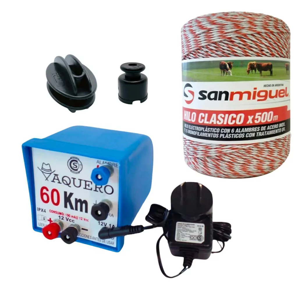 El Kit Vaquero Dual 60 km ofrece la posibilidad de operar con 220v y respaldo de batería de 12v. Este kit es perfecto para cercar terrenos medianos en zonas rurales, proporcionando una contención efectiva y segura de hasta 60 km.