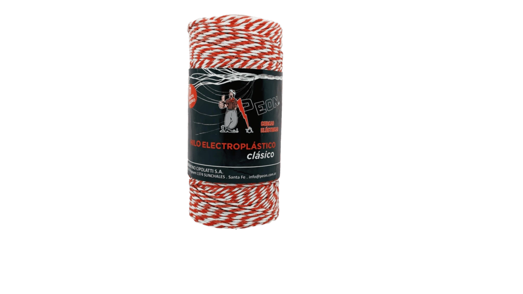 Este hilo electroplástico Peón de 250 metros es ideal para cercas eléctricas móviles, ofreciendo alta conductividad y durabilidad para el manejo seguro del ganado. Con 7 hebras de acero y 16 hilos de polietileno protegidos contra rayos UV, este hilo para boyero eléctrico es una excelente opción para mantener voltaje y efectividad en la línea, destacándose por su modelo rojo y blanco de alta visibilidad.